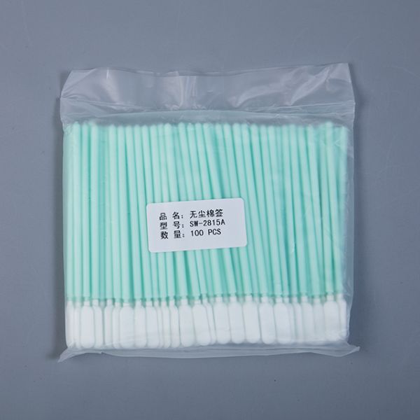 Cleanroom Swab is constructed from double-layer polyester cloth that is free from organic contaminants such as silicone, amides or phthalate esters. The cloth is thermally bonded to the handle, thus, eliminating the use of contaminating adhesive or coatings. Laundered and packed under an ISO Class 4 Cleanroom, the foam exhibits low particulate and ionic content. It has excellent compatibility with most common solvents including acetone as well as excellent sorbency and solvent-holding capacity. The double-layer polyester fiber head is compressed and possesses good firmness. The fiber head is designed for cleaning small, slotted and recessed areas. The excellent cleaning is controlled and supported flexible Paddle. The swab handle is ESD-safe and is made from polypropylene. The handle is compact and will not contribute to particulate or organic contamination. Designed for general purpose cleaning.